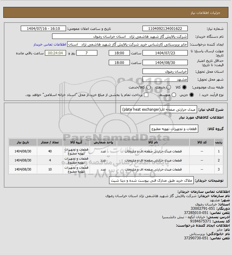 نام دستگاه خریدار:شرکت پالایش گاز شهید هاشمی نژاد استان خراسان رضوی
