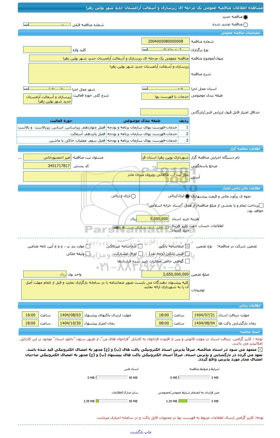 | عنوان/موضوع مناقصه | مناقصه عمومی یک مرحله ای زیرسازی و آسفالت آرامستان جدید شهر بوئین زهرا | ||||||||||||||