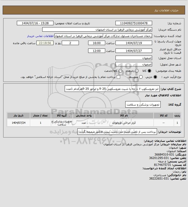 شرح کلی نیاز: لنز نفروسکوپ ۶ درجه با شیت نفروسکوپی 25 fr و اپراتور 25 frهرکدام 1عدد