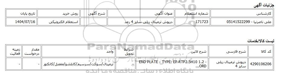 استعلام الکترونیکی درپوش ترمینال ریلی سایز 4 رعد, استعلام الکترونیکی، درپوش ترمینال ریلی سایز 4 رعد