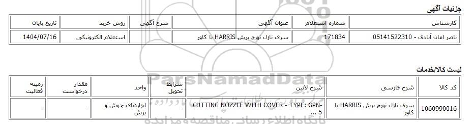 ناصر امان آبادی - 05141522310 | 171834 | سری نازل تورچ برش HARRIS با کاور | استعلام الکترونیکی | 1404/07/16 |