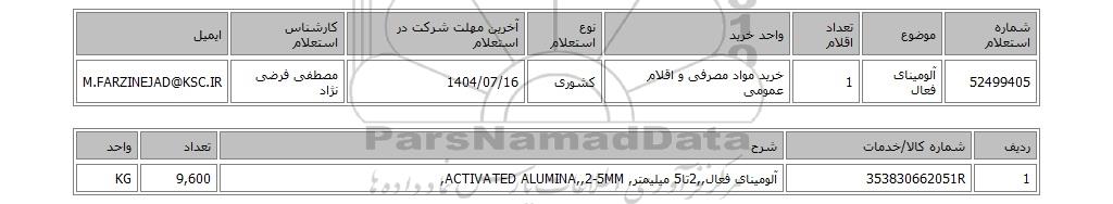 52499405آلومینای فعال1خرید مواد مصرفی و اقلام عمومیکشوری1404/07/16مصطفی فرضی نژادM.FARZINEJAD@KSC.IR