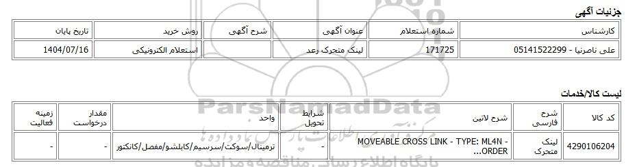 4290106204 | لینک متحرک | MOVEABLE CROSS LINK - TYPE: ML4N - ORDER... | - | ترمینال/سوکت/سرسیم/کابلشو/مفصل/کانکتور | - | - |