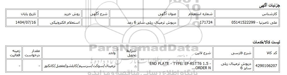 استعلام الکترونیکی درپوش ترمینال ریلی سایز 6 رعد, استعلام الکترونیکی، درپوش ترمینال ریلی سایز 6 رعد
