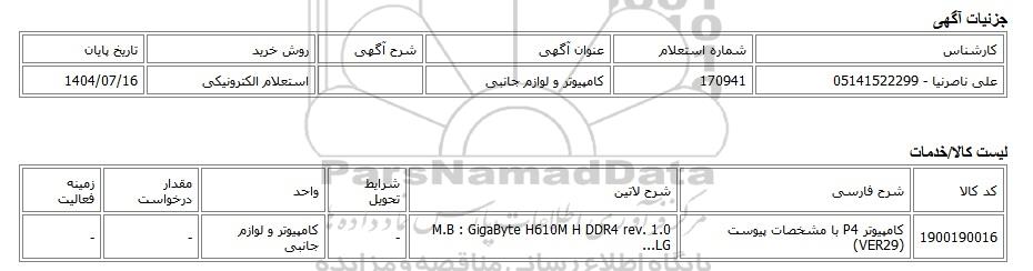 علی ناصرنیا - 05141522299 | 170941 | کامپیوتر و لوازم جانبی | استعلام الکترونیکی | 1404/07/16 |