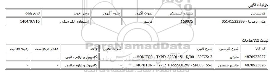 علی ناصرنیا - 05141522299 | 169075 | مانیتور | استعلام الکترونیکی | 1404/07/16 |