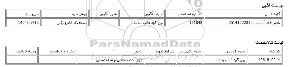 ناصر امان آبادی - 05141522310 | 171843 | پین گوه قالب بندی | استعلام الکترونیکی | 1404/07/16 |