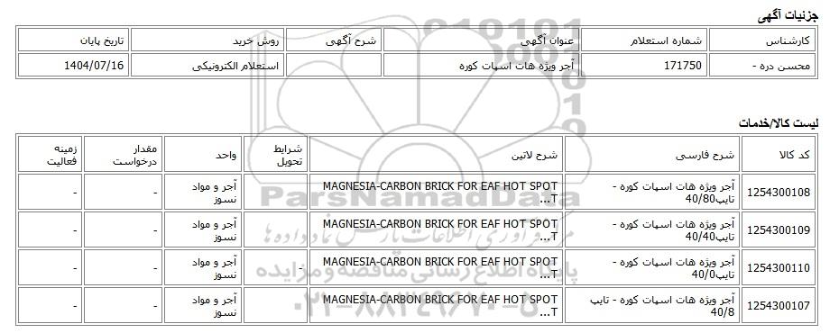 محسن دره - | 171750 | آجر ویژه هات اسپات کوره | استعلام الکترونیکی | 1404/07/16 |