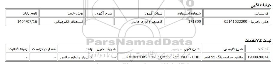 علی ناصرنیا - 05141522299 | 171399 | کامپیوتر و لوازم جانبی | استعلام الکترونیکی | 1404/07/16 |