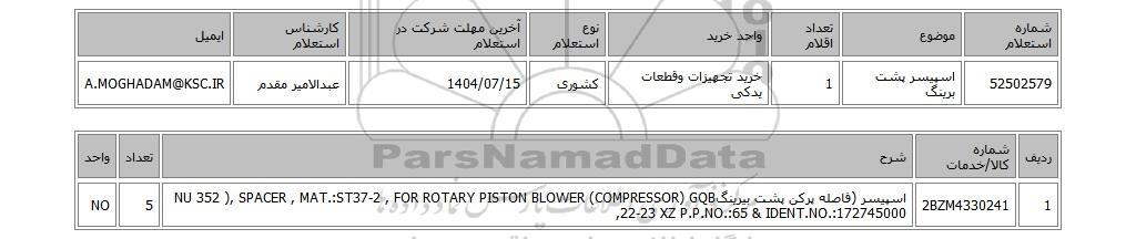 52502579اسپیسر پشت برینگ1خرید تجهیزات وقطعات یدکیکشوری1404/07/15عبدالامیر مقدمA.MOGHADAM@KSC.IR