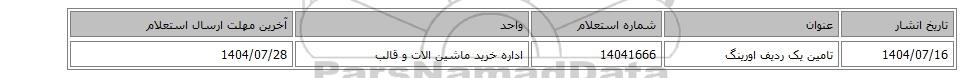 | 1404/07/16 | تامین یک ردیف اورینگ | 14041666 | اداره خرید ماشین الات و قالب | 1404/07/28 |