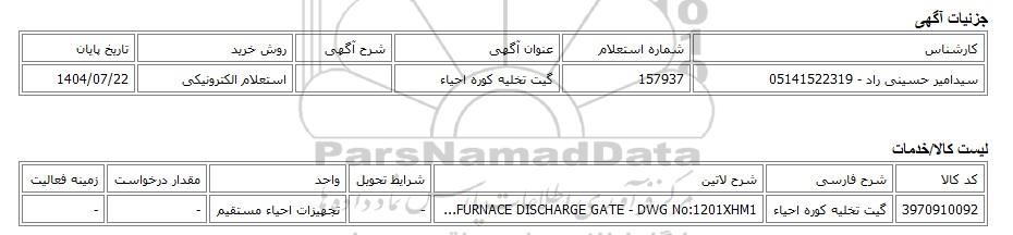 سیدامیر حسینی راد - 05141522319 | 157937 | گیت تخلیه کوره احیاء | استعلام الکترونیکی | 1404/07/22 |