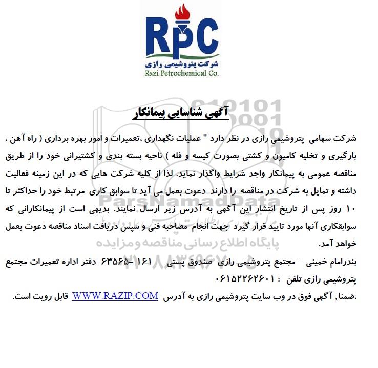 شرکت سهامی پتروشیمی رازی در نظر دارد عملیات نگهداری، تعمیرات و امور بهره برداری ( راه آهن ، بارگیری و تخلیه کامیون و کشتی بصورت کیسه و فله) ناحیه بسته بندی و کشتیرانی خود را از طریق مناقصه عمومی به پیمانکار واجد شرایط واگذار نماید لذا از کلیه شرکتهایی که در این زمینه فعالیت داشته و تمایل به شرکت در مناقصه را دارند دعوت بعمل میآید تا سوابق کاری مرتبط خود را حداکثر تا 10 روز پس از تاریخ انتشار این آگهی به آدرس زیر ارسال نمایند. بدیهی است از پیمانکارانی که سوابقکاری آنها مورد تایید قرار گیرد جهت انجام مصاحبه فنی و سپس دریافت اسناد مناقصه دعوت بعمل خواهد آمد.