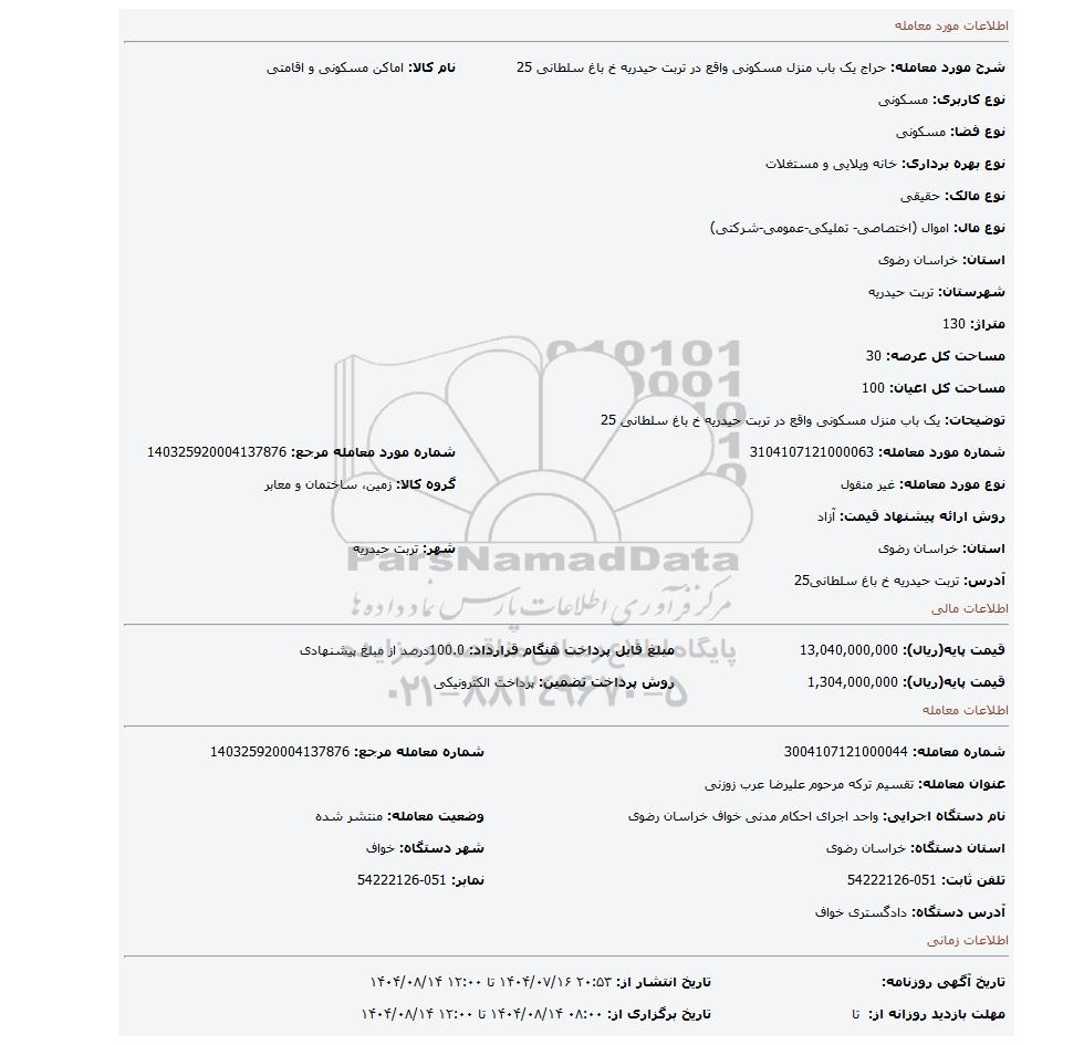 | شرح مورد معامله: حراج یک باب منزل مسکونی واقع در تربت حیدریه خ باغ سلطانی 25 | نام کالا: اماکن مسکونی و اقامتی | |