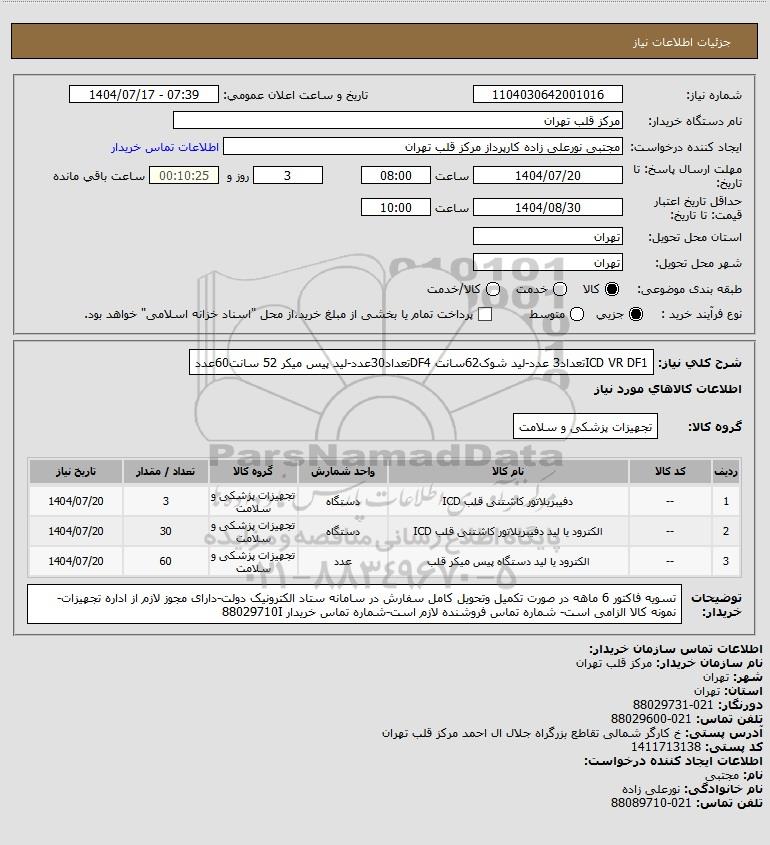 شرح کلی نیاز: ICD VR DF1تعداد3 عدد-لید شوک62سانت DF4تعداد30عدد-لید پیس میکر 52 سانت60عدد