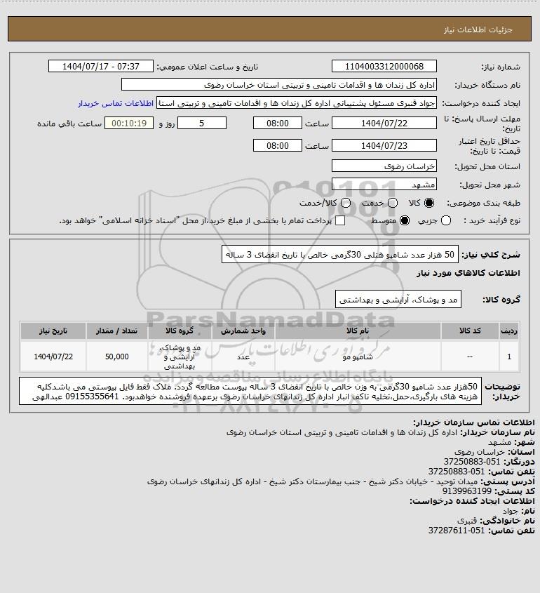 توضیحات خریدار:50هزار عدد شامپو 30گرمی به وزن خالص با تاریخ انقضای 3 ساله پیوست مطالعه گردد. ملاک فقط فایل پیوستی می باشدکلیه هزینه های بارگیری،حمل،تخلیه تاکف انبار اداره کل زندانهای خراسان رضوی برعهده فروشنده خواهدبود. 09155355641 عبدالهی