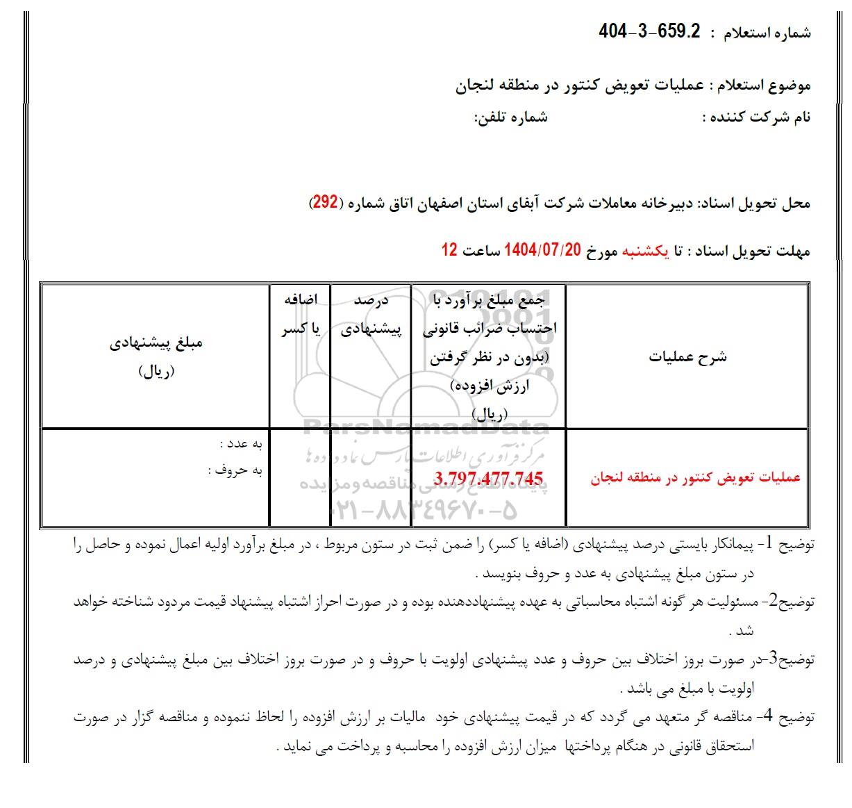 نحوه دریافت اسناد و ارسال پیشنهاد: متقاضیان میتوانند با ثبت نام در سامانه مناقصات و مزایدات ایران (پارس نماد) نسبت به مشاهده اسناد استعلام، دریافت اطلاعات تکمیلی، و ثبت پیشنهاد قیمت خود اقدام نمایند. در صورت نیاز به دریافت راهنمایی یا پشتیبانی در خصوص استعلام و مناقصه و فراخوان مناقصه عمومی، مناقصه محدود، مناقصه بین المللی، مناقصه دولتی، مناقصه خصوصی، مناقصه آنلاین فروش تجهیزات، مناقصه مشاورهای مناقصه پتروشیمی و انرژی مناقصه صنایع و تجهیزات برق و مخابرات و نفت و گاز ... لطفاً با سایت خبری مناقصه و مزایده پارسنماد دادهها به شماره 88349670 تماس حاصل فرمایید.