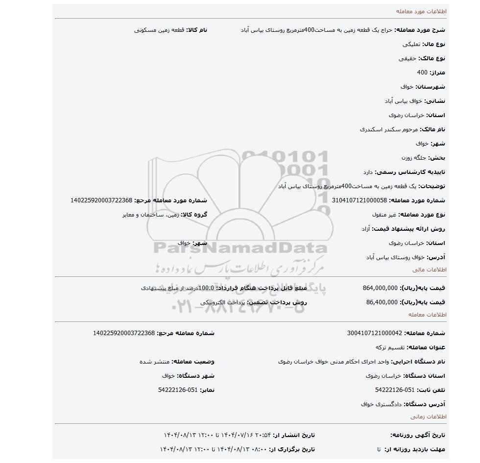 | شماره مورد معامله: 3104107121000058 | شماره مورد معامله مرجع: 140225920003722368 | |