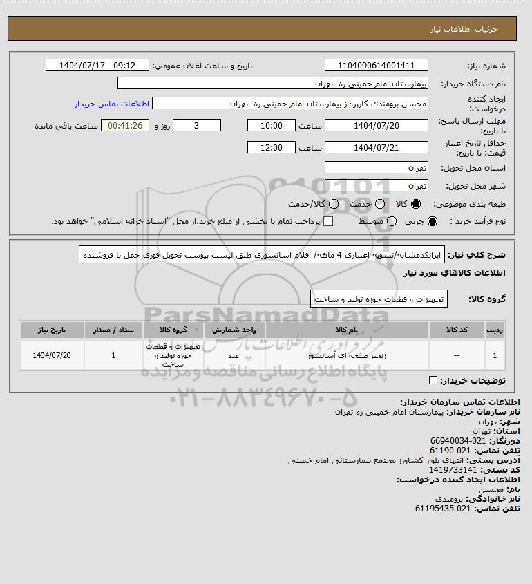استعلام بها و موضوع استعلام استعلام ایرانکدمشابه/تسویه اعتباری 4 ماهه/ اقلام اسانسوری طبق لیست پیوست تحویل فوری حمل با فروشنده به اطلاع کلیه شرکت‌ها و افراد متخصص واجد شرایط می‌رساند، آگهی گذار در نظر دارد از طریق استعلام بها، نسبت به انتخاب و دریافت پیشنهادات اقدام نماید. این استعلام با کد آگهی ثبت شده در سامانه خبرگزاری پارس نماد : 9671123 منتشر شده است. مشخصات استعلام : تاریخ شروع استعلام: 1404/07/17 آخرین مهلت ارسال پیشنهاد قیمت : 1404/07/20 و محل اجرای پروژه : استان تهران میباشد. استعلام قیمت مورد درخواست : استعلام ایرانکدمشابه/تسویه اعتباری 4 ماهه/ اقلام اسانسوری طبق لیست پیوست تحویل فوری حمل با فروشنده با دسته‌بندی‌های تخصصی و گروه های مرتبط : زنجیر صنعتی, آسانسور, استعلام اطلاع رسانی میگردد.