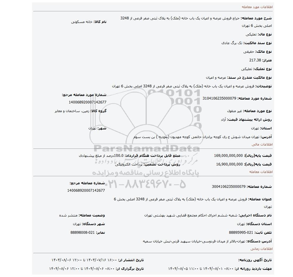 | شرح مورد معامله: حراج فروش عرصه و اعیان یک باب خانه (ملک) به پلاک ثبتی صفر فرعی از 3248 اصلی بخش 6 تهران | نام کالا: خانه مسکونی | |
