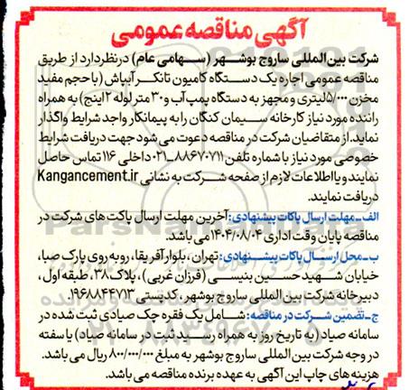 شرکت بین المللی ساروج بوشهر (سهامی عام) در نظر دارد از طریق مناقصه عمومی اجاره یک دستگاه کامیون تانکر آبپاش با حجم مفید مخزن 5.000 لیتری و مجهز به دستگاه پمپ آب و 30 متر لوله (2 اینج) به همراه راننده مورد نیاز کارخانه سیمان کنگان را به پیمانکار واجد شرایط واگذار نماید. از متقاضیان شرکت در مناقصه دعوت میشود جهت دریافت شرایط خصوصی مورد نیاز با شماره تلفن 886707110-021 داخلی 116 تماس حاصل نمایند و یا اطلاعات لازم از صفحه شرکت به نشانی Kangancement.ir دریافت نمایند.