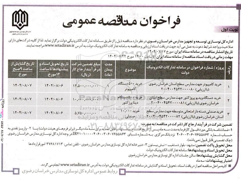 | 1 | خرید کامپیوتر جهت مدارس سطح استان خراسان رضوی (با ارزیابی) 2004004542000080 | خرید 500 دستگاه کامپیوتر | 1 | 12.500.000.000 |