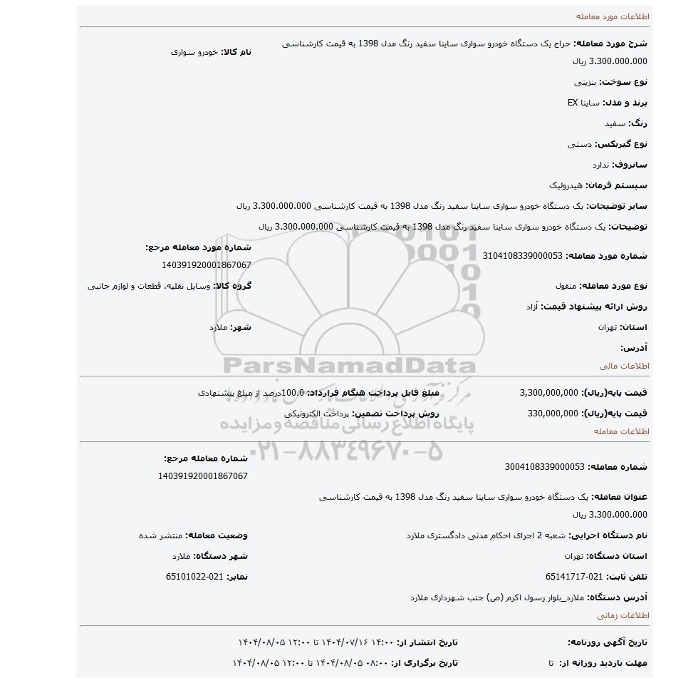 | سایر توضیحات: یک دستگاه خودرو سواری ساینا سفید رنگ مدل 1398 به قیمت کارشناسی 3.300.000.000 ریال | ||
