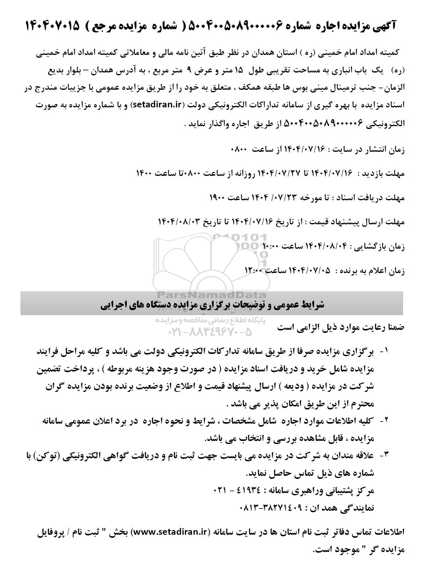 کمیته امداد امام خمینی (ره) استان همدان در نظر طبق آئین نامه مالی و معاملاتی کمیته امداد امام خمینی (ره) یک باب انباری به مساحت تقریبی طول 15 متر و عرض 9 مترمربع به آدرس همدان، بلوار بدیع الزمان؛ جنب ترمینال مینی بوس ها طبقه همکف متعلق به خود را از طریق مزایده عمومی با جزییات مندرج در اسناد مزایده با بهره گیری از سامانه تداراکات الکترونیکی دولت ستاد ایران و با شماره مزایده به صورت الکترونیکی 5004005089000006 از طریق اجاره واگذار نماید .