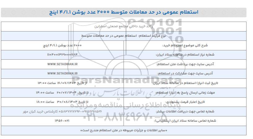 شرح کلی موضوع استعلام خرید: 2000 عدد بوشن 4/1.1 اینچ