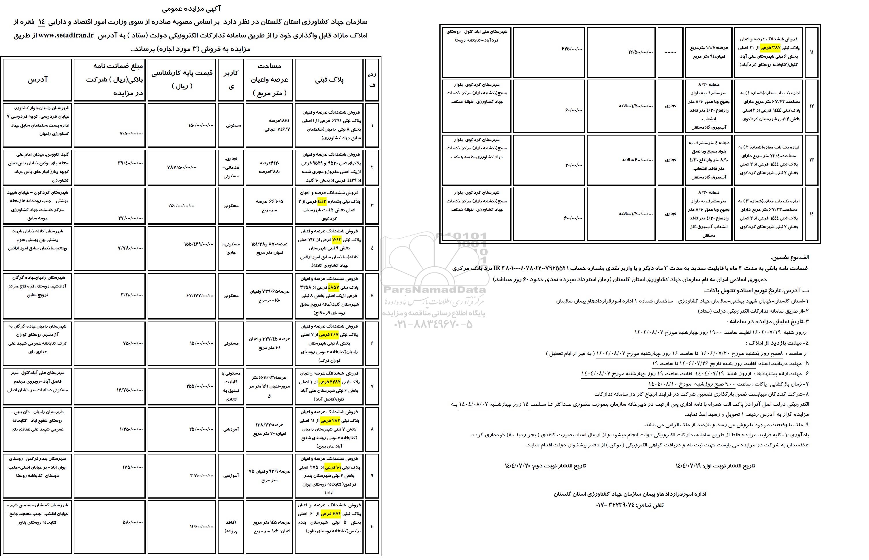 سازمان جهاد کشاورزی استان گلستان در نظر دارد براساس مجوز صادره از سوی وزارت امور اقتصاد و دارایی، 14 فقره از املاک مازاد قابل واگذاری خود را از طریق سامانه تدارکات الکترونیی دولت (ستاد) به آدرس ستاد ایران از طریق مزایده به فروش (3 مورد اجاره) برساند.