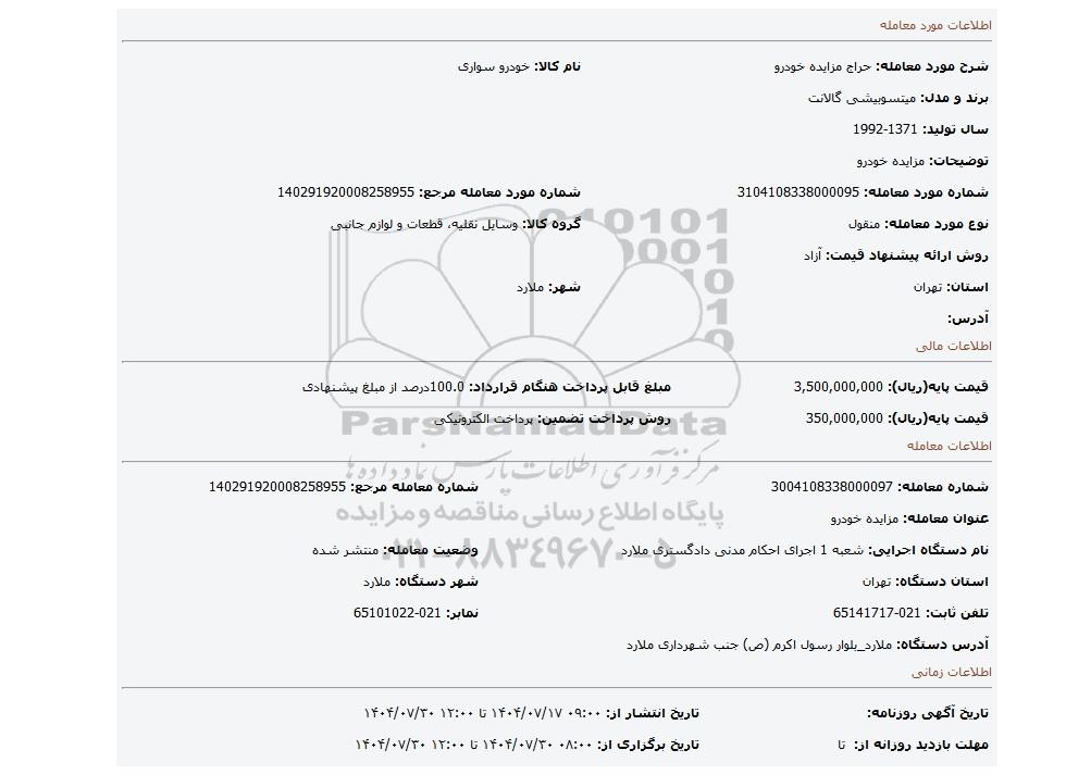 | شماره مورد معامله: 3104108338000095 | شماره مورد معامله مرجع: 140291920008258955 | |