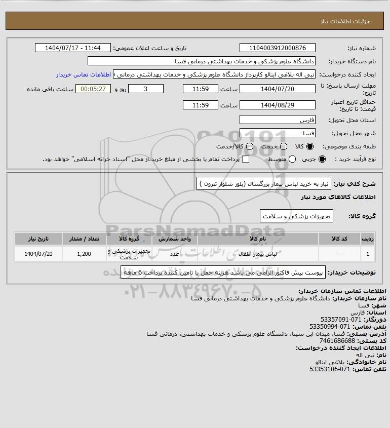 | 1 | -- | لباس بیمار اطفال | عدد | تجهیزات پزشکی و سلامت | 1,200 | 1404/07/20 |