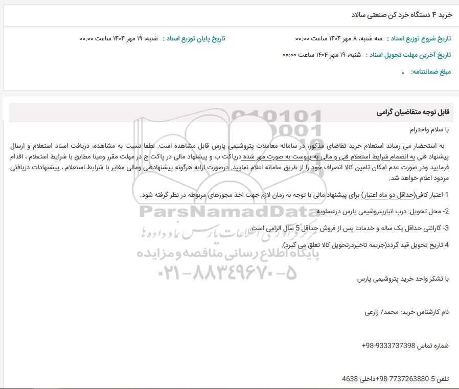 به استحضار می رساند استعلام خرید تقاضای مذکور در سامانه معاملات پتروشیمی پارس قابل مشاهده است. لطفا نسبت به مشاهده دریافت اسناد استعلام و ارسال پیشنهاد فنی به انضمام شرایط استعلام فنی و مالی به پیوست به صورت مهر شده در پاکت ب و پیشنهاد مالی در پاکت ج در مهلت مقرر وعينا مطابق با شرایط استعلام ، اقدام فرمایید و در صورت عدم امکان تامین کالا انصراف خود را از طریق سامانه اعلام نمایید در صورت ارایه هرگونه پیشنها دفنی و مالی مغایر با شرایط استعلام ، پیشنهادات دریافتی مردود اعلام خواهد شد.
