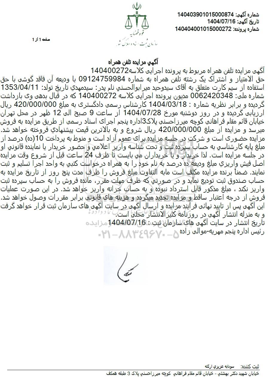 آگهی مزایده تلفن همراه مربوط به پرونده اجرایی کلاسه 140400272