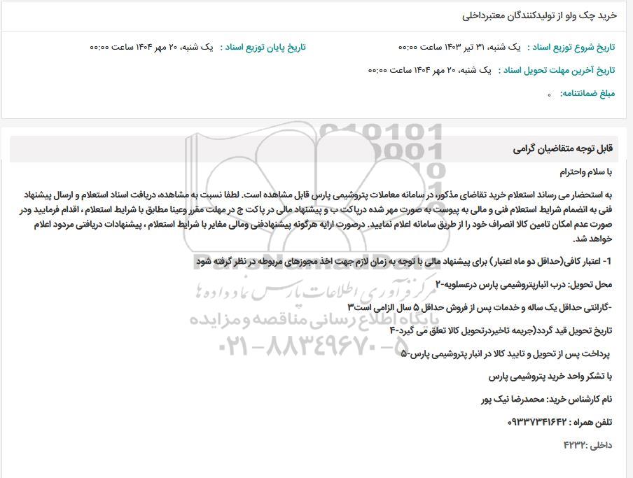 به استحضار میرساند استعلام خرید تقاضای مذکور در سامانه معاملات پتروشیمی پارس قابل مشاهده است. لطفا نسبت به مشاهده دریافت اسناد استعلام و ارسال پیشنهاد فنی به انضمام شرایط استعلام فنی و مالی به پیوست به صورت مهر شده در پاکت ب و پیشنهاد مالی در پاکت ج در مهلت مقرر وعينا مطابق با شرایط استعلام ، اقدام فرمایید و در صورت عدم امکان تامین کالا انصراف خود را از طریق سامانه اعلام نمایید. در صورت ارایه هرگونه پیشنها دفنی و مالی مغایر با شرایط استعلام ، پیشنهادات دریافتی مردود اعلام خواهد شد.