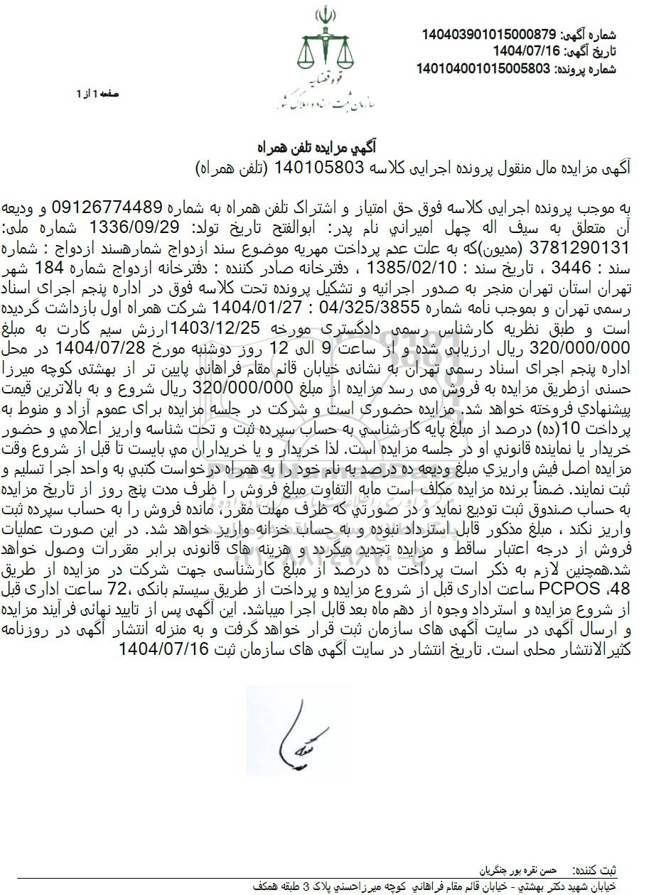 آگهی مزایده مال منقول پرونده اجرایی کلاسه 140105803 تلفن همراه