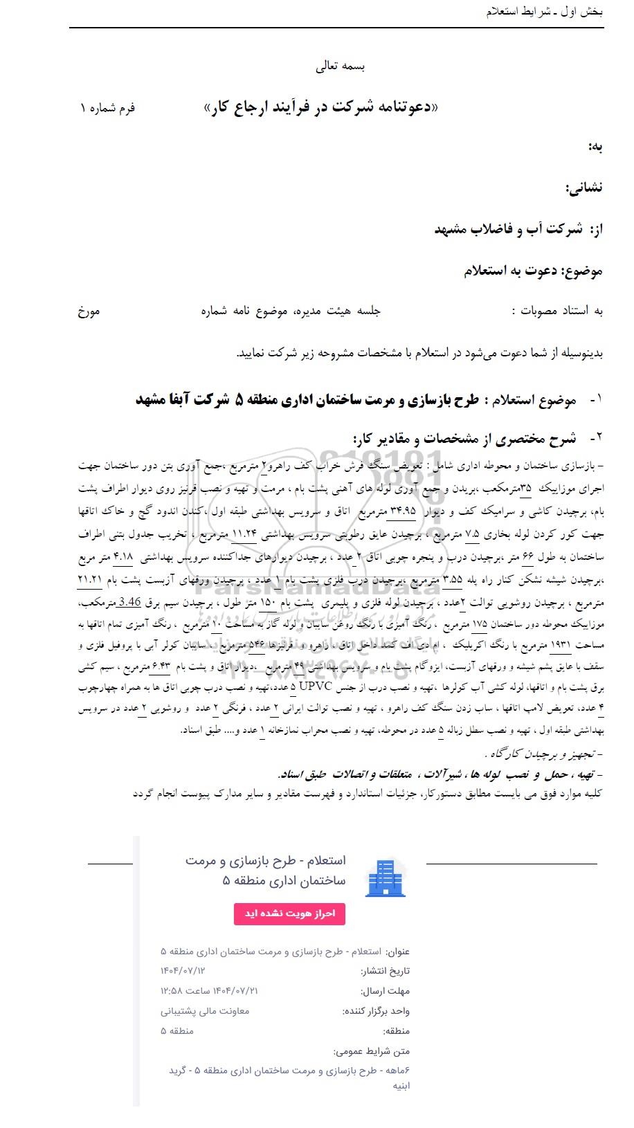 1- موضوع استعلام : طرح بازسازی و مرمت ساختمان اداری منطقه 5 شرکت آبفا مشهد