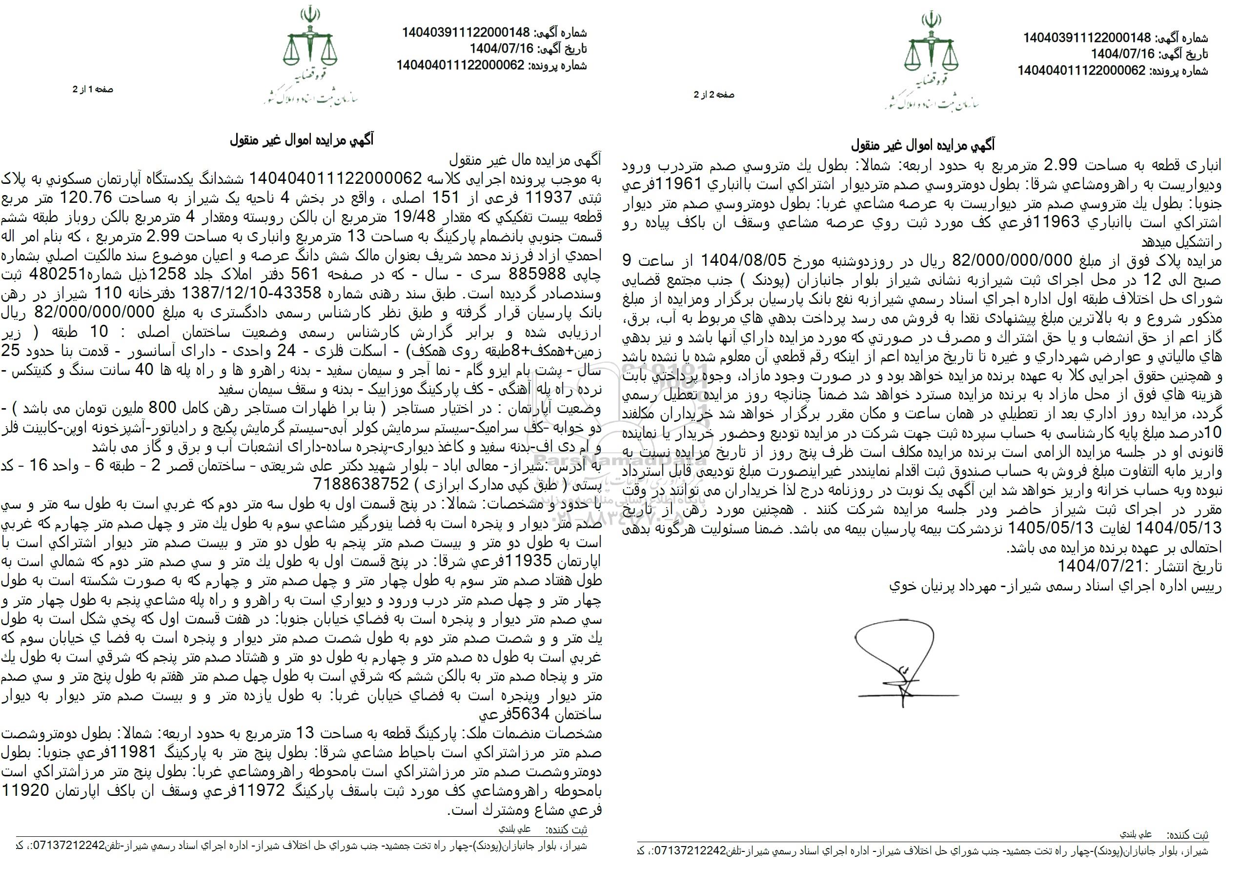 انباری قطعه به مساحت 2.99 متر مربع به حدود اربعه شمالا بطول يك متروسي صدم متر درب ورود و دیواریست به راهرو مشاعي شرقا بطول دومتروسي صحم متر دیوار اشتراکی است با انباری 11961 فرعي جنوبا يطول يك متروسي صدم متر دیواریست به عرصه مشاعی غربا بطول دومتروسي صدم متر دیوار اشتراکی است با انباري 11963 فرعي كف مورد ثبت روي عرصه مشاعي وسقف ان باکف پیاده رو را تشکیل میدهدمزایده پلاک فوق از مبلغ 82.000.000.000 ریال در روز دوشنبه مورخ 1404.08.05 از ساعت 9 صبح الی 12 در محل اجرای ثبت شیراز به نشانی شیراز بلوار جانبازان (پودنک ( جنب مجتمع قضایی شورای حل اختلاف طبقه اول اداره اجرای اسناد رسمي شيراز به نفع بانک پارسیان برگزار و مزایده از مبلغ مذکور شروع و به بالاترین مبلغ پیشنهادی نقدا به فروش میرسد پرداخت بدهي هاي مربوط به آب برق گاز اعم از حق انشعاب و یا حق اشتراك و مصرف در صورتی که مورد مزایده داراي آنها باشد و نیز بدهی هاي مالياتي و عوارض شهرداری و غیره تا تاریخ مزایده اعم از اینکه رقم قطعی آن معلوم شده یا نشده باشد و همچنین حقوق اجرایی کلا به عهده برنده مزایده خواهد بود و در صورت وجود مازاد، وجوه پرداختی بابت هزينه هاي فوق از محل مازاد به برنده مزایده مسترد خواهد شد ضمنا چنانچه روز مزایده تعطیل رسمی گردد. مزایده روز اداری بعد از تعطیلی در همان ساعت و مکان مقرر برگزار خواهد شد خریداران مکلفند 10 درصد مبلغ پایه کارشناسی به حساب سپرده ثبت جهت شرکت در مزایده تودیع و حضور خریدار یا نماینده احتمالی بر عهده برنده مزایده می باشد. قانونی او در جلسه مزایده الزامی است برنده مزایده مکلف است ظرف پنج روز از تاریخ مزایده نسبت به واریز مابه التفاوت مبلغ فروش به حساب صندوق ثبت اقدام نمایند در غیر اینصورت مبلغ تودیعی قابل استرداد نبوده و به حساب خزانه واریز خواهد شد این آگهی یک نوبت در روزنامه درج لذا خریداران می توانند در وقت مقرر در اجرای ثبت شیراز حاضر و در جلسه مزایده شرکت کنند همچنین مورد رهن از تاریخ 1404.05.13 لغایت 1405.05.13 نزد شرکت بیمه پارسیان بیمه می باشد. ضمنا مسئولیت هرگونه بدهی1404.07.21 : تاریخ انتشار