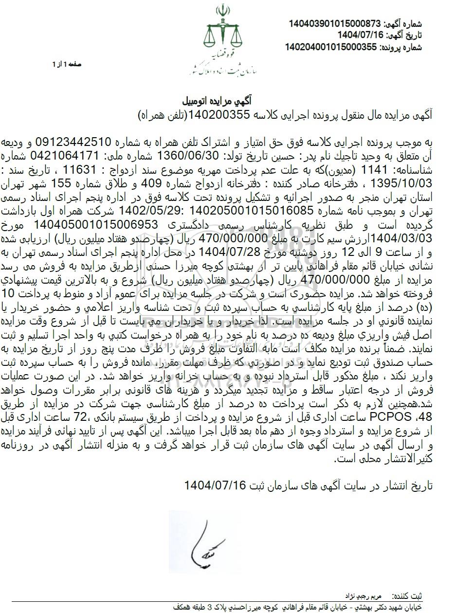 آگهی مزایده مال منقول پرونده اجرایی کلاسه 140200355 تلفن همراه
