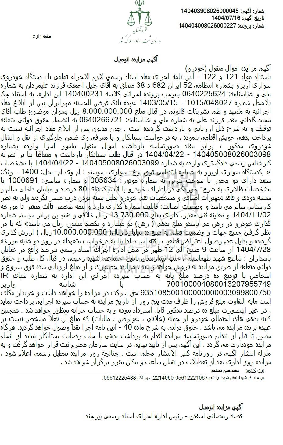 باستناد مواد 121 و 122 - آئین نامه اجرای مفاد اسناد رسمی لازم الاجراء تمامى یک دستگاه خودروی سواری آریزو بشماره انتظامی 52 ایران 682 د 38 متعلق به آقای جلیل احمدی فرزند علیمردان به شماره ملی و شناسنامه 0640225624 بموجب پرونده اجرائی کلاسه 140400231 این اداره به استناد چک بلا محل شماره 1015.048027 - 1403.05.15 عهده بانک قرض الحسنه مهرایران پس از ابلاغ مفاد اجرائیه به متعهد و طی تشریفات قانونی در قبال مبلغ 8.000.000.000 ریال بعنوان موضوع طلب آقای محمد گلدانی مقدم فرزند علی به شماره ملی و شناسنامه 0640266721 به انضمام حقوق دولتی متعلقه توقیف و به شرح ذیل ارزیابی و بازداشت گردیده است. چون مدیون پس از ابلاغ مفاد اجرا اجرائیه نسبت به پرداخت بدهی خویش اقدامی ننموده، به درخواست بستانکار و با معرفی وی ضمن جلوگیری از نقل و انتقال خودروی مذکور ، برابر مفاد صورتجلسه بازداشت اموال منقول مامور اجرا وارده بشماره 140405008026003098 - 1404.04.22 در قبال طلب بستانکار بازداشت و متعاقباً بنا بر نظریه کارشناس رسمی دادگستری وارده به شماره 140405008026003099 - 1404.04.22 با مشخصات یکدستگاه سواری آریزو به شماره انتظامی فوق نوع سواری سیستم : ام وی ام مدل 1400 - رنگ سفید دارای دو محور با سوخت بنزین به شماره موتور 005634 و شماره شاسی: 1000691 با مشخصات ظاهری به شرح خوردگی در اطراف خودرو با لاستیکهای 80 درصد و مبلمان داخلی سالم و شیشه دودی و فاقد تجهیزات اضافی و مشخصات فنی خودرو بدلیل بسته بودن درب میسر نگردید ولی به نظر کارشناس سالم میباشد و وضعیت اصالت قابلیت شماره گذاری دارد و بیمه شخص ثالث معتبر تا مورخه 1404.11.02 و معاینه فنی معتبر دارای مبلغ 13.730.000 ریال خلافی و همچنین برابر سیستم شماره گذاری خودرو در رهن می باشد و مبلغ بدهی ( رهن دو میلیارد و یکصد میلیون ریال می باشد که با در نظر گرفتن جمیع جهات و وضعیت فعلی به مبلغ ده میلیارد ریال 10.000.000.000 ریال  ارزش گذاری گردیده و بدلیل عدم وصول اعتراض قطعیت یافته است. لذا بنا به درخواست متعهدله در روز دو شنبه مورخه 1404.7.28 از ساعت 9 صبح الى 12 ظهر در محل اداره اجرای اسناد رسمی بیرجند واقع در خیابان پاسداران : تقاطع شهید طهماسبی ، جنب بیمارستان تامین اجتماعی شهید رحیمی در قبال كل طلب و حقوق دولتی متعلقه از طریق مزایده به فروش خواهد رسید. مزایده حضوری و از مبلغ ارزیابی شده فوق شروع و اشخاص با تودیع ده درصد مبلغ پایه به حساب سپرده اجرائی این اداره به شماره شبای IR 700100004080013207955749