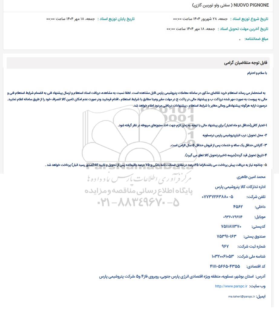 به استحضار می رساند استعلام خرید تقاضای مذکور در سامانه معاملات پتروشیمی پارس قابل مشاهده است. لطفا نسبت به مشاهده دریافت اسناد استعلام و ارسال پیشنهاد فنی به انضمام شرایط استعلام فنی و مالی به پیوست به صورت مهر شده در پاکت ب و پیشنهاد مالی در پاکت ج در مهلت مقرر و عینا مطابق با شرایط استعلام، اقدام فرمایید و در صورت عدم امکان تامین کالا انصراف خود را از طریق سامانه اعلام نمایید. در صورت ارایه هرگونه پیشنهاد فنی و مالی مغایر با شرایط استعلام . پیشنهادات دریافتی مردود اعلام خواهد شد.