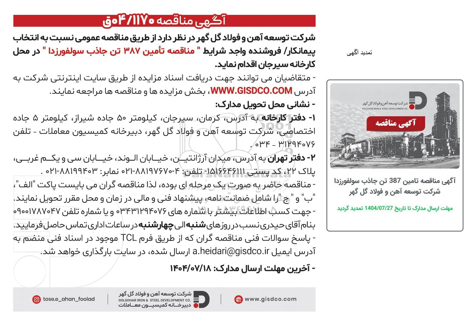 شرکت توسعه آهن و فولاد گل گهر در نظر دارد داز طریق مناقصه عمومی نسبت به انتخاب پیمانکار / فروشنده واجد شرایط "مناقصه تامین 387 تن جاذب سولفورزدا" در محل کارخانه سیرجان اقام نماید. متقاضیان می توانند جهت دریافت اسناد مزایده از طریق سایت اینترنتی شرکت به آدرس WWW.GISDCO.COM بخش مزایده ها و مناقصه ها مراجعه نمایند.