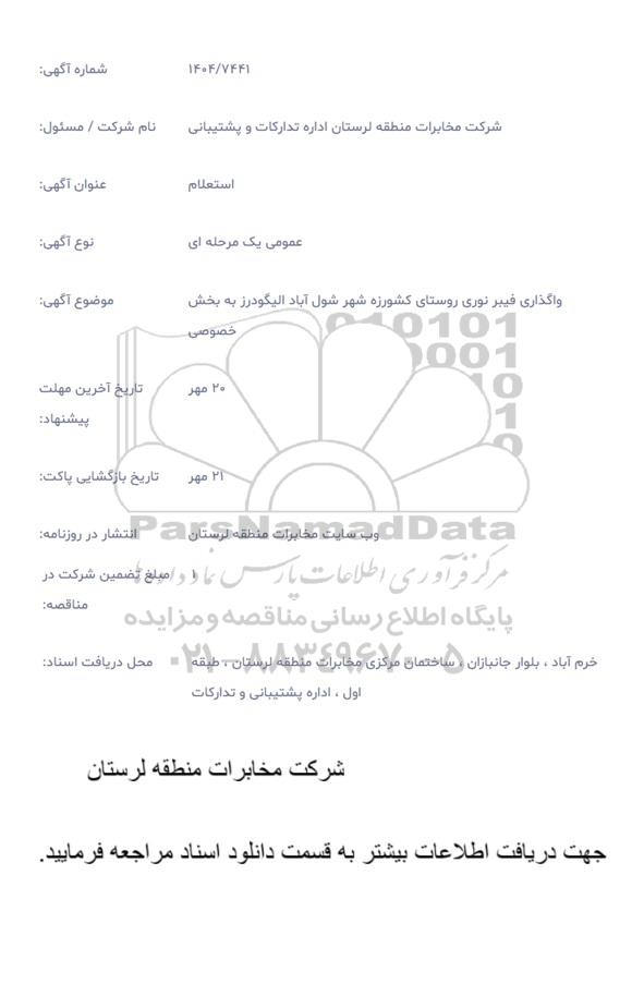 محل دریافت اسناد: خرم آباد، بلوار جانبازان، ساختمان مرکزی مخابرات منطقه لرستان، طبقه اول، اداره پشتیبانی و تدارکات
