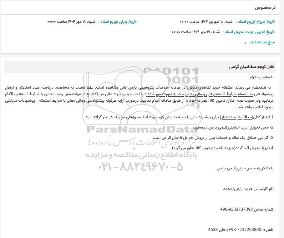به استحضار می رساند استعلام خرید تقاضای مذکور در سامانه معاملات پتروشیمی پارس قابل مشاهده است. لطفا نسبت به مشاهده دریافت اسناد استعلام و ارسال پیشنهاد فنی به انضمام شرایط استعلام فنی و مالی به پیوست به صورت مهر شده در پاکت ب و پیشنهاد مالی در پاکت ج در مهلت مقرر و عینا مطابق با شرایط استعلام ، اقدام فرمایید و در صورت عدم امکان تامین کالا انصراف خود را از طریق سامانه اعلام نمایید در صورت ارایه هرگونه پیشنهاد فنی و مالی مغایر با شرایط استعلام پیشنهادات دریافتی مردود اعلام خواهد شد.