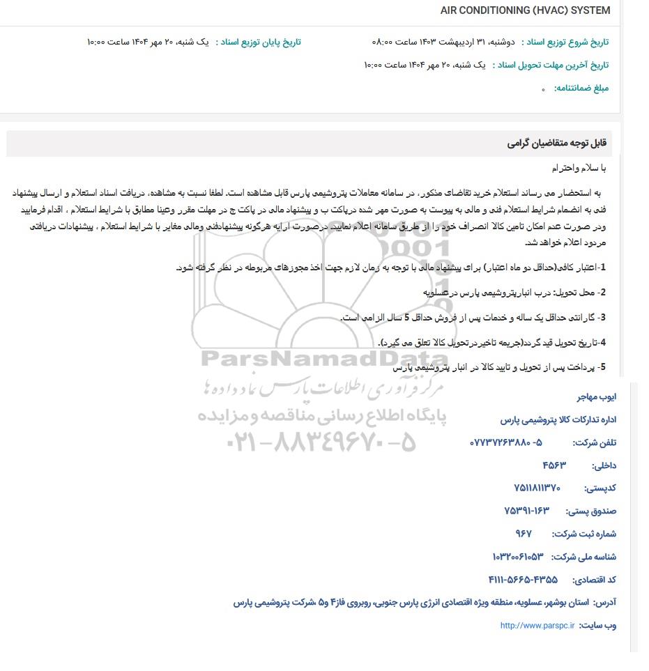 به استحضار میرساند استعلام خرید تقاضای مذکور در سامانه معاملات پتروشیمی پارس قابل مشاهده است. لطفا نسبت به مشاهده، دریافت اسناد استعلام و ارسال پیشنهاد فنی به انضمام شرایط استعلام فنی و مالی به پیوست به صورت مهر شده دریاکت ب و پیشنهاد مالی در پاکت ج در مهلت مقرر وعينا مطابق با شرایط استعلام ، اقدام فرمایید و در صورت عدم امکان تامین کالا انصراف خود را از طریق سامانه اعلام نمایید. در صورت ارایه هرگونه پیشنهاد فنی و مالی مغایر با شرایط استعلام پیشنهادات دریافتی مردود اعلام خواهد شد.