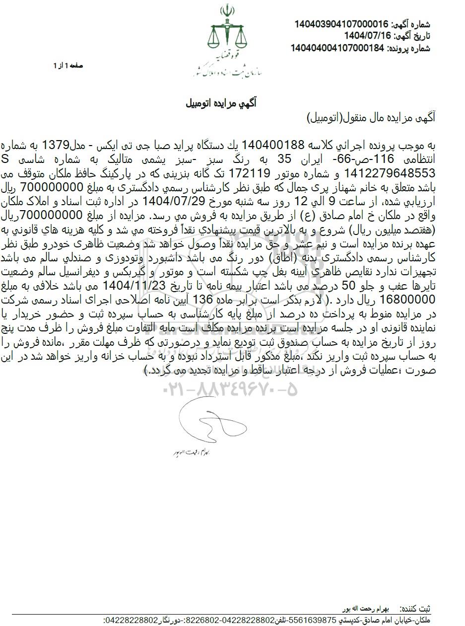 به موجب پرونده اجرائی کلاسه 140400188 یک دستگاه پراید صبا جی تی ایکس - مدل 1379 به شماره انتظامی -116 - ص - 6- ایران 35 به رنگ سبز سبز یشمی متالیک به شماره شاسی S 1412279648553 و شماره موتور 172119 تک گانه بنزینی که در پارکینگ حافظ ملکان متوقف می باشد متعلق به خانم شهناز پری جمال که طبق نظر کارشناس رسمی دادگستری به مبلغ 700000000 ریال ارزیابی شده از ساعت 9 الی 12 روز سه شنبه مورخ 1404.07.29 در اداره ثبت اسناد و املاک ملکان واقع در ملکان خ امام صادق (ع) از طریق مزایده به فروش می رسد. مزایده از مبلغ 700000000 ریال هفتصد میلیون ریال شروع و به بالاترین قیمت پیشنهادی نقداً فروخته میشد و کلیه هزینه های قانونی به عهده برنده مزایده است و نیم عشر و حق مزایده نقداً وصول خواهد شد وضعیت ظاهری خودرو طبق نظر کارشناس رسمی دادگستری بدنه (اطاق) دور رنگ میباشد داشبورد و تودوزی و صندلی سالم می باشد تجهیزات ندارد نقایص ظاهری آیینه بغل چپ شکسته است و موتور و گیربکس و دیفرانسیل سالم وضعیت تایرها عقب و جلو 50 درصد میباشد اعتبار بیمه نامه تا تاریخ 1404.11.23 می باشد خلافی به مبلغ 16800000 ریال دارد . لازم بذکر است برابر ماده 136 آیین نامه اصلاحی اجرای اسناد رسمی شرکت در مزایده منوط به پرداخت ده درصد از مبلغ پایه کارشناسی به حساب سپرده ثبت و حضور خریدار یا نماینده قانونی او در جلسه مزایده است برنده مزایده مکلف است ما به التفاوت مبلغ فروش را ظرف مدت پنج روز از تاریخ مزایده به حساب صندوق ثبت تودیع نماید و در صورتی که ظرف مهلت مقرر مانده فروش را به حساب سپرده ثبت واریز نکند ، مبلغ مذکور قابل استرداد نبوده و به حساب خزانه واریز خواهد شد در این صورت عملیات فروش از درجه اعتبار ساقط و مزایده تجدید می گردد.