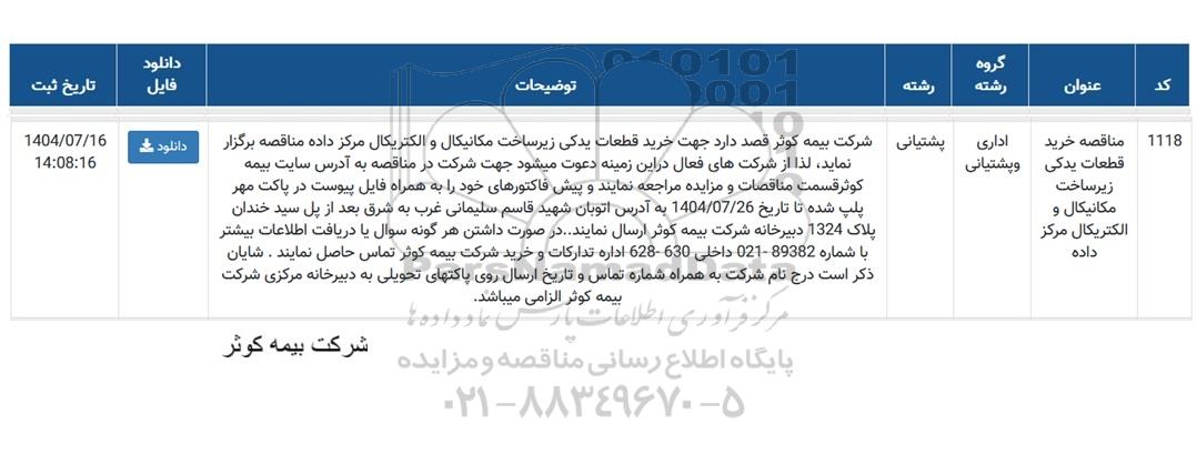 | 1118 | مناقصه خرید قطعات یدکی زیر ساخت مکانیکال و الکتریکال مرکز داده | اداری و پشتیبانی | پشتیبانی | شرکت بیمه کوثر قصد دارد جهت خرید قطعات یدکی زیر ساخت مکانیکال و الکتریکال مرکز داده مناقصه برگزار نماید لذا از شرکتهای فعال در این زمینه دعوت میشود جهت شرکت در مناقصه به آدرس سایت بیمه کوثر قسمت مناقصات و مزایده مراجعه نمایند و پیش فاکتورهای خود را به همراه فایل پیوست در پاکت مهر پلپ شده تا تاریخ 1404.07.26 به آدرس اتوبان شهید قاسم سلیمانی غرب به شرق بعد از پل سید خندان پلاک 1324 دبیرخانه شرکت بیمه کوثر ارسال نمایند. در صورت داشتن هر گونه سوال یا دریافت اطلاعات بیشتر با شماره 89382-021 داخلی 630 -628 اداره تدارکات و خرید شرکت بیمه کوثر تماس حاصل نمایند . شایان ذکر است درج نام شرکت به همراه شماره تماس و تاریخ ارسال روی پاکتهای تحویلی به دبیرخانه مرکزی شرکت بیمه کوثر الزامی می باشد. | دانلود | 1404.7.16 14:08:16 |