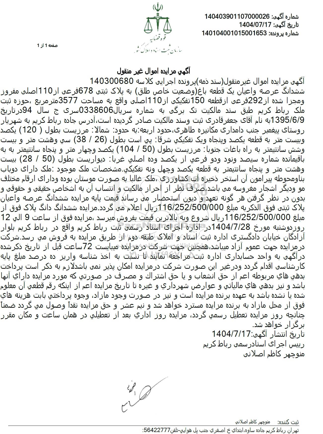آگهی مزایده اموال غیر منقول سند ذمه پرونده اجرایی کلاسه 140300680 ششدانگ عرصه و اعیان یک قطعه باغ وضعیت خاص طلق به پلاک ثبتی 678 فرعی از 110 اصلی مفروز و مجزا شده از 292 فرعی از قطعه 150 تفکیکی از 110 اصلی واقع به مساحت 3577 متر مربع ، حوزه ثبت ملک رباط كریم طبق سند مالکیت تک برگی به شماره سریال 0338606 سری ج سال 94 در تاریخ 1395.6.9 به نام آقای جعفر قادری ثبت و سند مالکیت صادر گردیده است آدرس جاده رباط کریم به شهریار روستای پیغمبر جنب دامداری مکانیزه طاهری حدود اربعه به حدود شمالا مرزیست بطول ( 120 ) یكصد و بیست متر به قطعه یکصد و پنجاه و یک تفکیکی شرقا پی است بطول (26) . (38) سی و هشت متر و بیست وشش سانتیمتر به راه باغات جنوبا مرزیست بطول (50) . (104) یکصد و چهار متر و پنجاه سانتیمتر به به باقیمانده شماره سیصد و نود و دو فرعی از یکصد وده اصلی غربا دیواریست بطول 50 . 28) بیست و هشت متر و پنجاه سانتیمتر به قطعه یکصد و چهل و نه تفكیكی . مشخصات ملک موجود ملک دارای دوباب بنا و محوطه پیرامون آن استخر ذخیره آب کشاورزی ملک، غالبا به صورت موستان بوده و دارای ارقام مختلف مو و دیگر اشجار مغروسه می باشد صرف نظر از احراز مالکیت و انتساب آن به اشخاص حقیقی و حقوقی و بدون در نظر گرفتن هر گونه تعهد و دیون استحضار میرساند قیمت پایه مزایده ششدانگ عرصه و اعیان پلاک ثبتى فوق الذكر به مبلغ 116.252.500.000 ریال اعلام میگردد. مزایده ششدانگ دانگ پلاک فوق از مبلغ 116.252.500.000 ریال شروع و به بالاترین قیمت بفروش میرسد مزایده فوق از ساعت 9 الی 12 روز دوشنبه مورخ 1404.7.28 در اداره اجرای اسناد رسمی ثبت رباط کریم واقع در رباط کریم بلوار آزادگان خیابان دادگستری اداره ثبت اسناد و املاک طبقه دوم از طریق مزایده به فروش می رسد. شرکت در مزایده جهت عموم آزاد میباشد همچنین جهت شرکت در مزایده میبایست 72 ساعت قبل از تاریخ ذکر شده در آگهی به واحد حسابداری اداره ثبت مراجعه نمایند تا نسبت به اخذ شناسه واریز ده درصد مبلغ پایه کارشناسی اقدام گردد و در غیر این صورت شرکت در مزایده امکان پذیر نمی باشد لازم به ذکر است پرداخت بدهی های مربوطه اعم از حق انشعاب و یا حق اشتراك و مصرف در صورتی که مورد مزایده دارای آنها باشد و نیز بدهی های مالیاتی و عوارض شهرداری و غیره تا تاریخ مزایده اعم از اینکه رقم قطعی أن معلوم شده یا نشده باشد به عهده برنده مزایده است و نیز در صورت وجود مازاد وجوه پرداختی بابت هزینه های فوق از محل مازاد به برنده مزایده مسترد خواهد شد و نیم عشر و حق مزایده نقداً وصول می گردد ضمنا چنانچه روز مزایده تعطیل رسمی گردد مزایده روز اداری بعد از تعطیلی در همان ساعت و مکان مقرر برگزار خواهد شد.