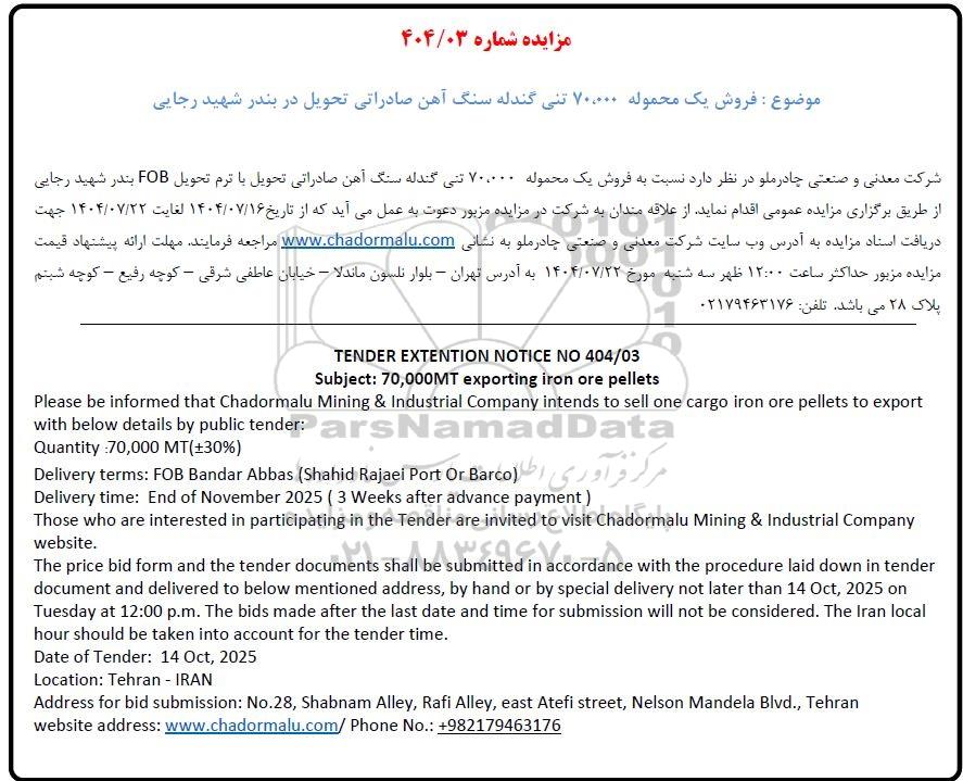 شرکت معدنی و صنعتی چادرملو در نظر دارد نسبت به فروش یک محموله 70.000 تنی گندله سنگ آهن صادراتی تحویل با ترم تحویل FOB بندر شهید رجایی از طریق برگزاری مزایده عمومی اقدام نماید از علاقه مندان به شرکت در مزایده مزبور دعوت به عمل می آید که از تاریخ 1404.7.16 لغایت 1404.7.22 جهت دریافت اسناد مزایده به آدرس وب سایت شرکت معدنی و صنعتی چادرملو به نشانی www.chadormalu.com مراجعه فرمایند مهلت ارائه پیشنهاد قیمت مزایده مزبور حداکثر ساعت 12 ظهر سه شنبه مورخ 1404.7.22 به آدرس تهران - بلوار نلسون ماندلا - خیابان عاطفی شرقی - کوچه رفیع - کوچه شبنم پلاک 28 می باشد. تلفن: 02179463176