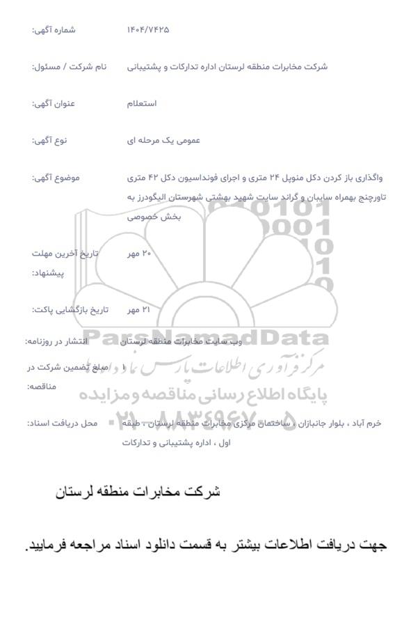 محل دریافت اسناد: خرم آباد، بلوار جانبازان، ساختمان مرکزی مخابرات منطقه لرستان، طبقه اول، اداره پشتیبانی و تدارکات